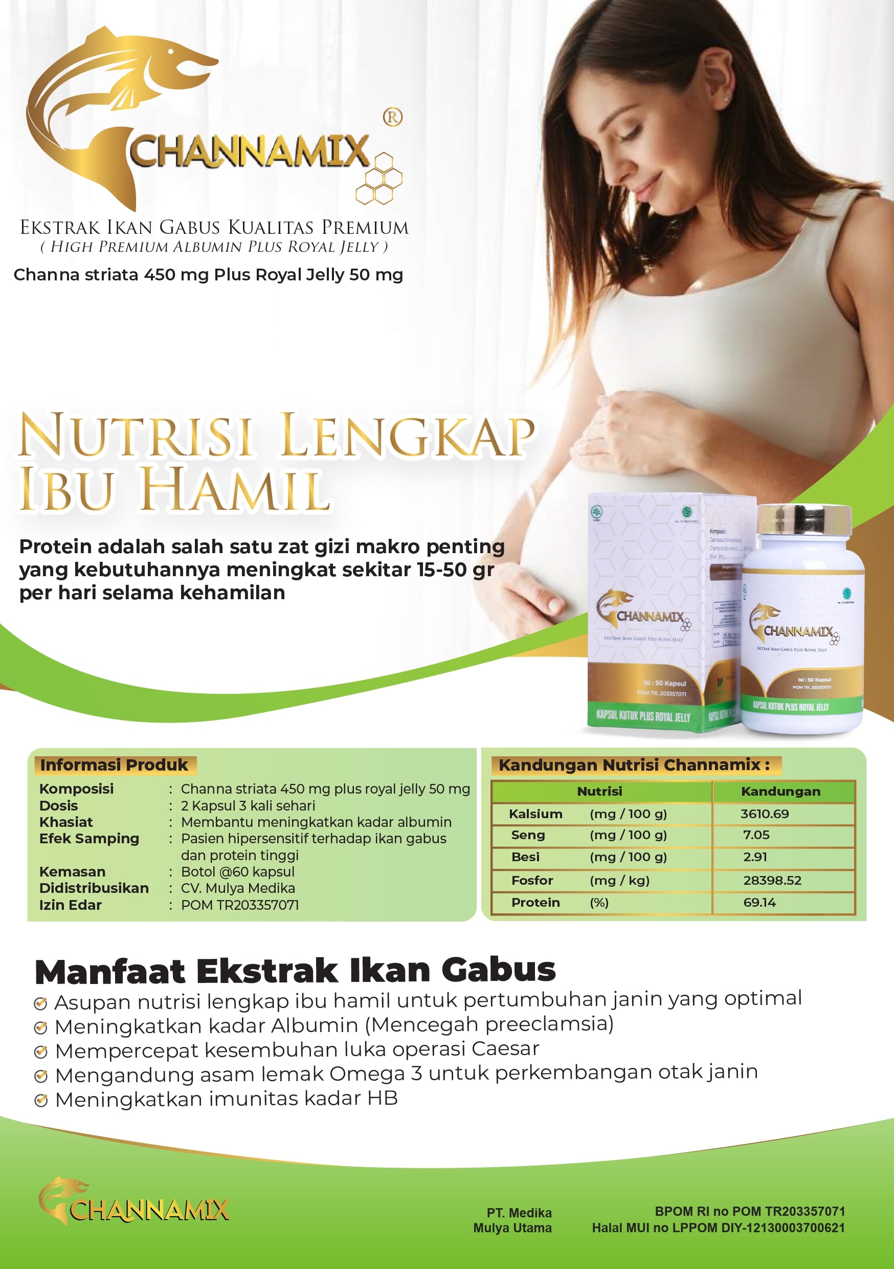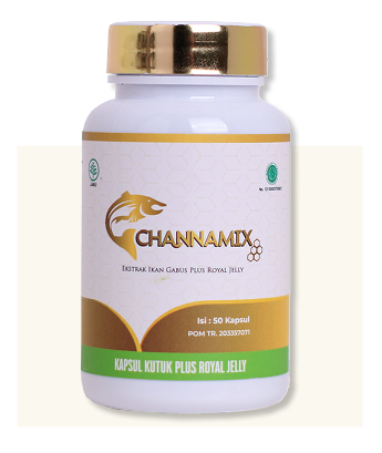 Channamix mengandung ekstrak ikan gabus kualitas premium sebagai sumber protein /albumin yang berfungsi untuk membantu mempercepat proses penyembuhan luka berbagai macam operasi.